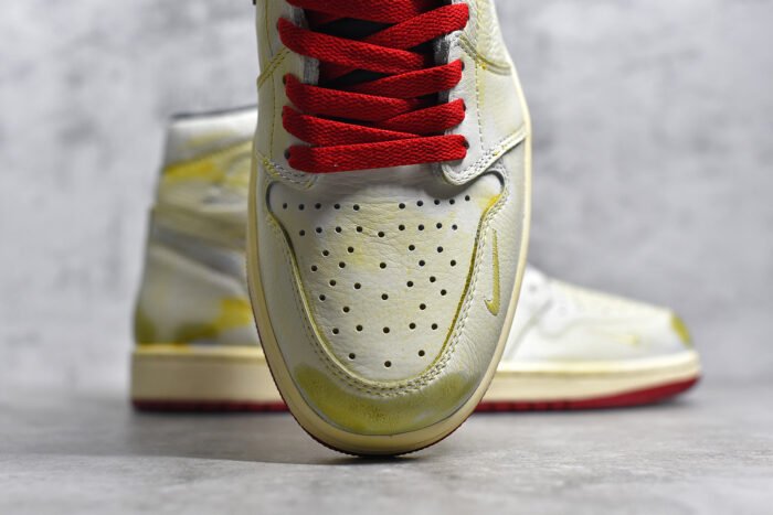 The Air Jordan 1 High Nigel Sylvester is a unique and stylish collaboration between Jordan Brand and BMX rider Nigel Sylvester. This high-top sneaker features a distressed and vintage-inspired look. with a premium leather upper in a sail colorway. giving it a worn-in and rugged aesthetic. The design is highlighted by scuff marks and intentional distressing. reflecting the wear and tear experienced during BMX riding. Signature details include a deconstructed Swoosh logo with visible stitching. reflective heel accents for added visibility. and Nigel Sylvester’s signature on the inner collar. With its unique design elements and premium construction. the Air Jordan 1 High Nigel Sylvester is a must-have for sneaker enthusiasts and fans of Nigel Sylvester’s daring style.