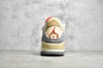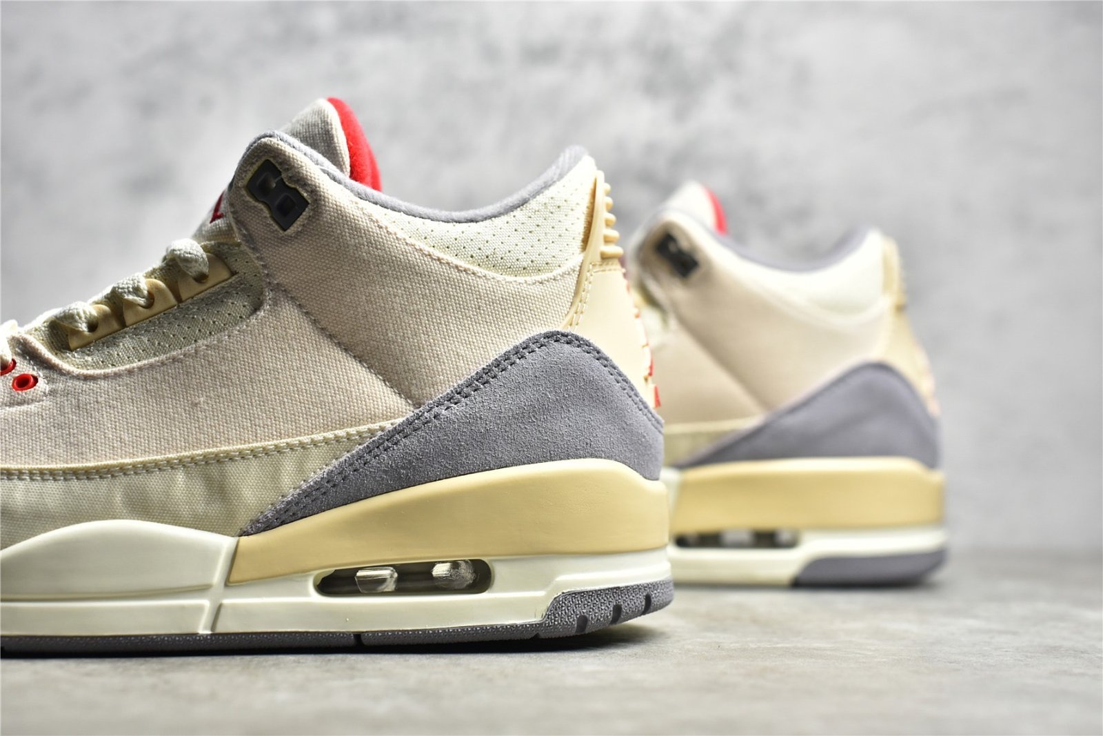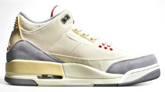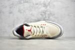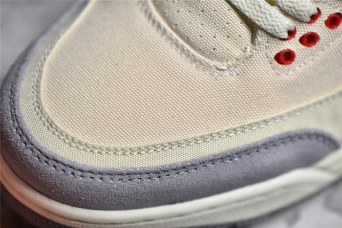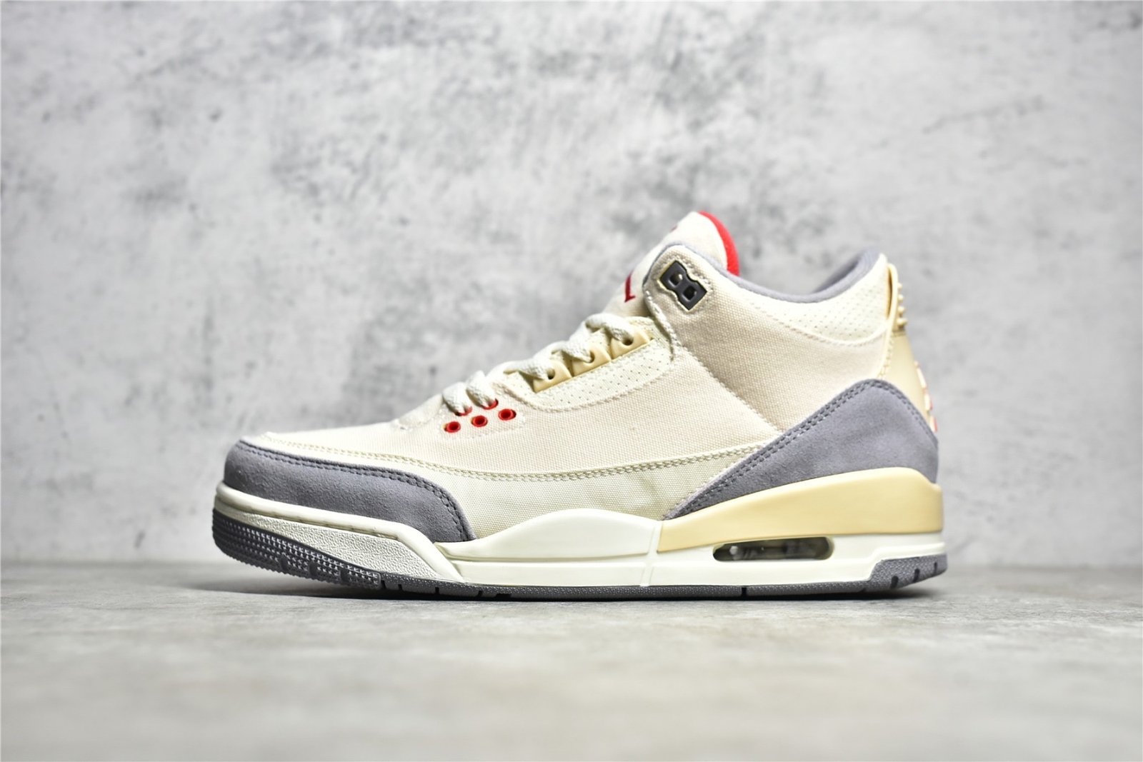 The Air Jordan 3 Retro SE ‘Muslin’ stands out with its clean design and premium materials. This iconic sneaker features a smooth. off-white canvas upper. offering a fresh and versatile look. The signature grey elephant print overlays on the toe and heel provide a classic touch. while the red accents on the eyelets. tongue. and midsole add a pop of color. The padded collar and tongue ensure extra comfort. while the visible Air-Sole unit in the heel delivers responsive cushioning. perfect for all-day wear. The durable rubber outsole with a herringbone pattern enhances traction and grip. This pair seamlessly blends heritage style with modern functionality. making it a must-have for sneaker enthusiasts.