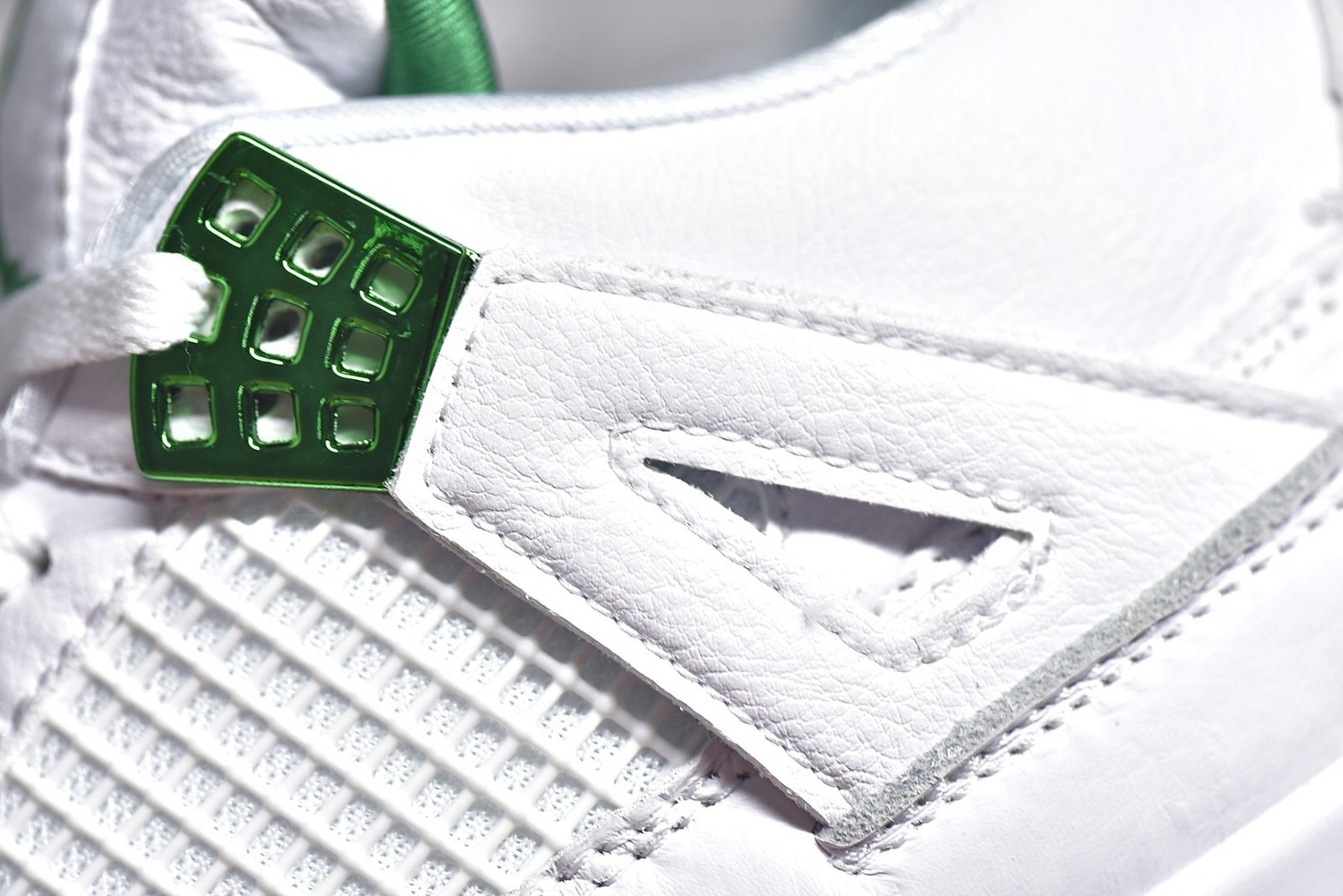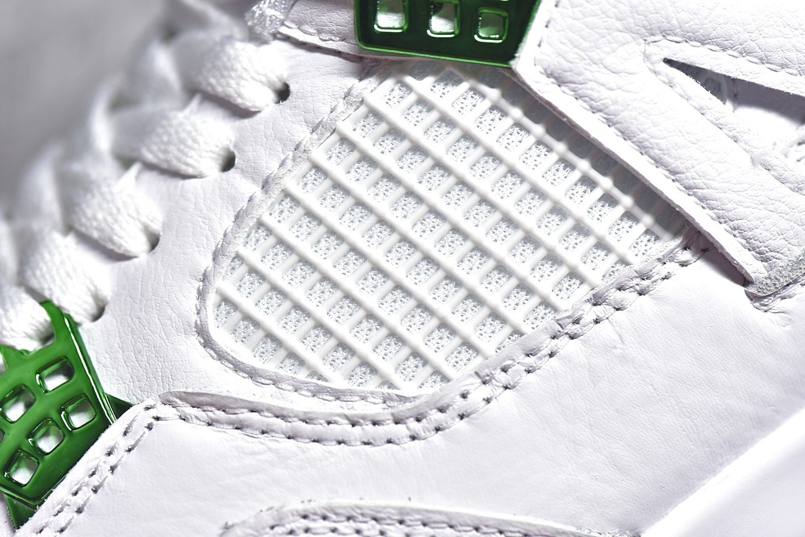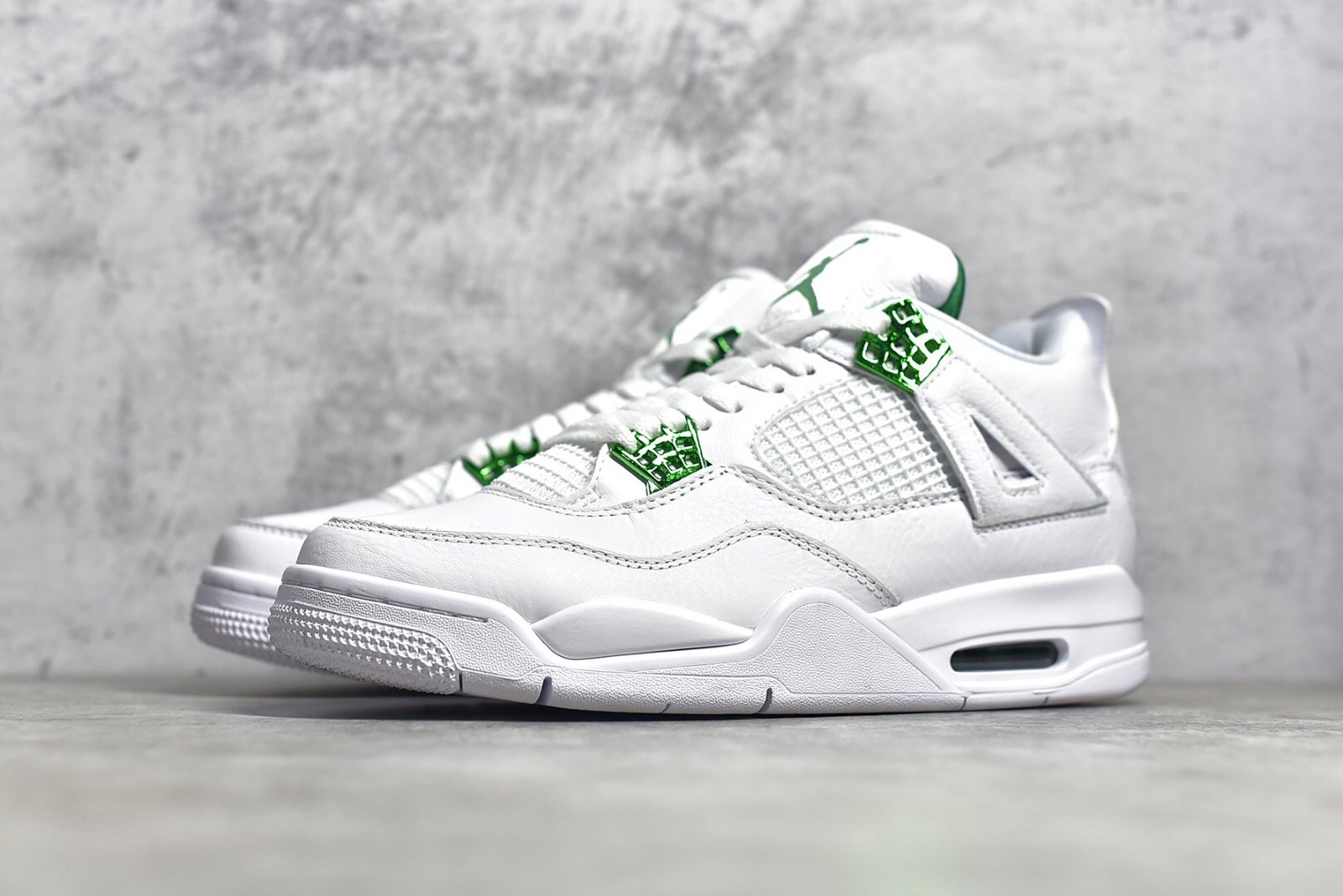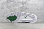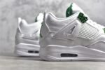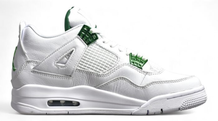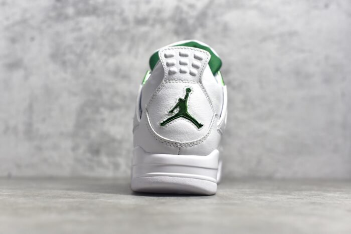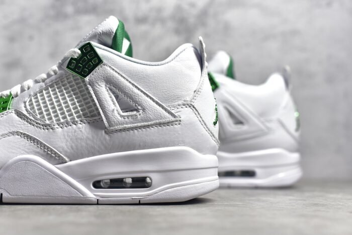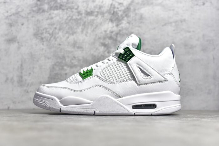 The Air Jordan 4 Retro ‘Green Metallic’ stands out with its sleek and minimalistic design. accentuated by vibrant green metallic accents. This iconic sneaker features a clean white leather upper that provides a fresh and crisp look. The green metallic eyelets and Jumpman logo add a pop of color and sophistication. enhancing the overall aesthetic. The mesh underlays ensure breathability. while the padded collar and tongue offer extra comfort. The visible Air-Sole unit in the heel delivers responsive cushioning. perfect for all-day wear. The durable rubber outsole with a herringbone pattern enhances traction and grip. This pair seamlessly blends heritage style with modern functionality. making it a must-have for sneaker enthusiasts.