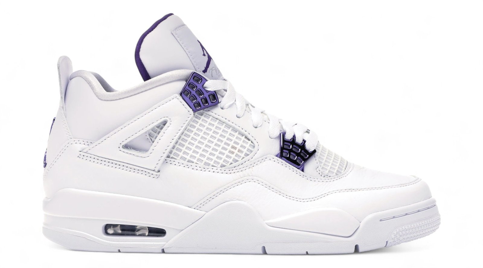 The Air Jordan 4 Retro ‘Purple Metallic’ is a standout with its bold colorway and premium materials. This iconic sneaker features a mix of purple leather and metallic silver accents. offering a vibrant and sleek look. The mesh underlays ensure breathability. while the padded collar and tongue provide extra comfort. The visible Air-Sole unit in the heel delivers responsive cushioning. perfect for all-day wear. Durable rubber outsole with a herringbone pattern enhances traction and grip. This pair epitomizes contemporary style and quality craftsmanship. making it a must-have for sneaker enthusiasts.