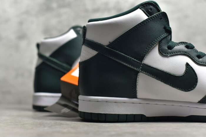 - Design Elements: Clean and simple design with Spartan Green as the main color. The shoe features Nike SB branding on the tongue tag and insoles. and a classic Dunk silhouette with overlays for added durability.