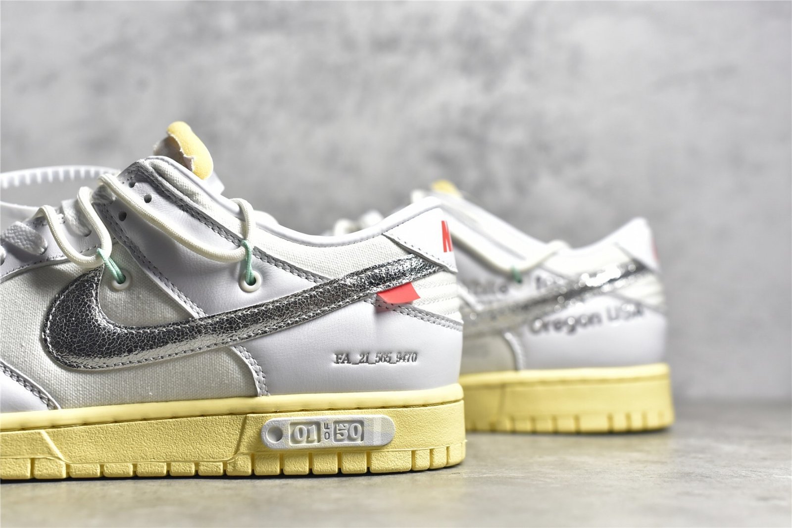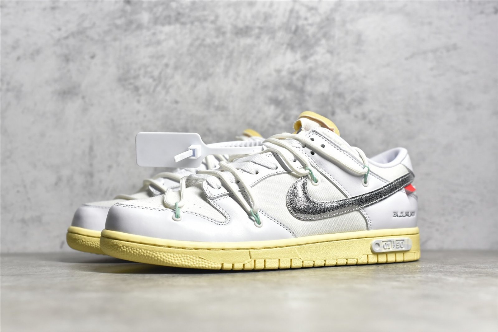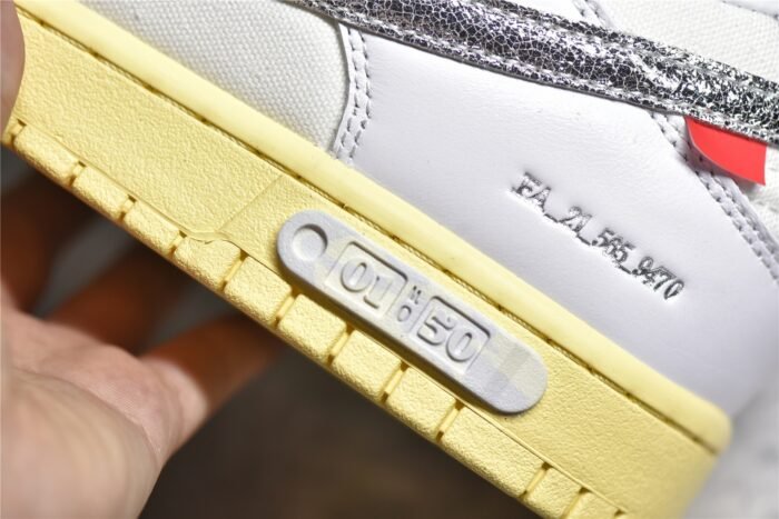 The Dunk Low Off-White Lot 1 DM1602-127 is part of Virgil Abloh’s exclusive “The 50” collection with Nike. Here are the typical features of this shoe:
