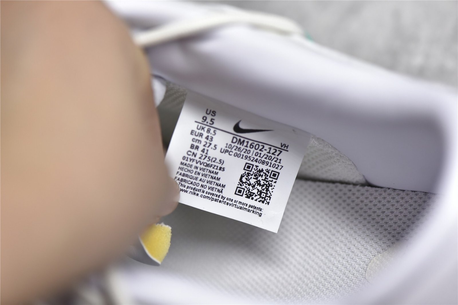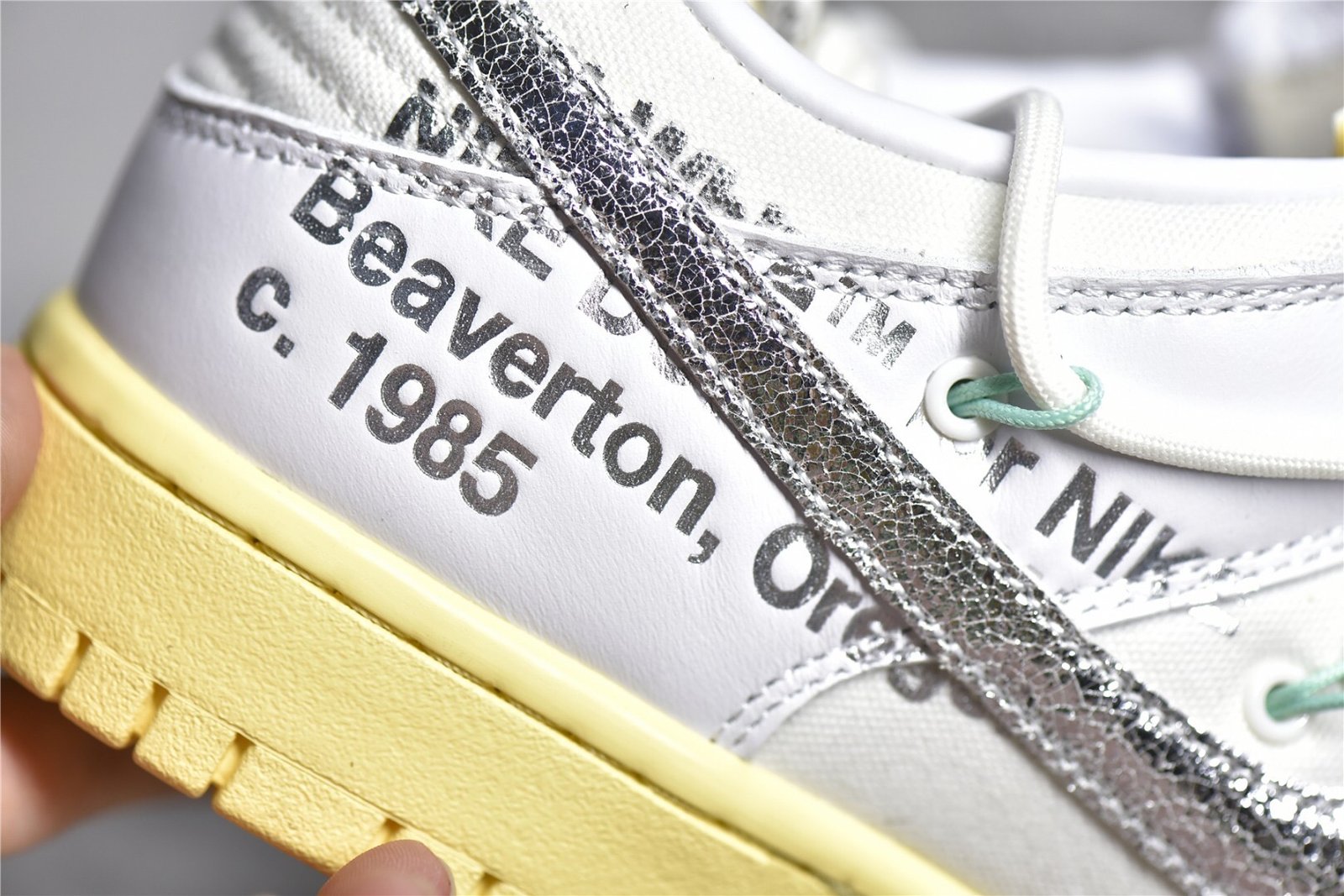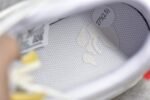 - Design Elements: This sneaker features a white and grey colorway with signature Off-White design elements. including the iconic zip-tie tag. exposed foam tongue. and Helvetica text branding. Bright accents. such as the silver secondary lacing system and neon green tab. add a pop of color. The lot number is indicated on a small tab. marking its unique place in the collection.