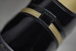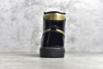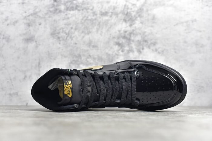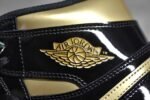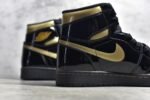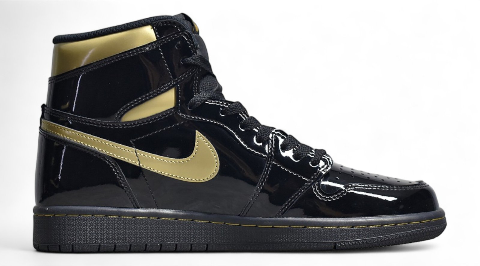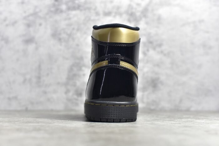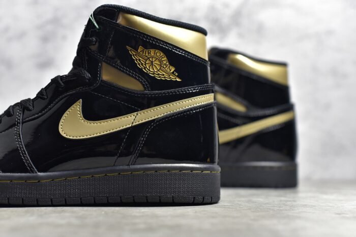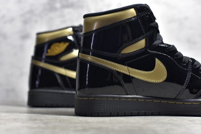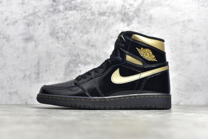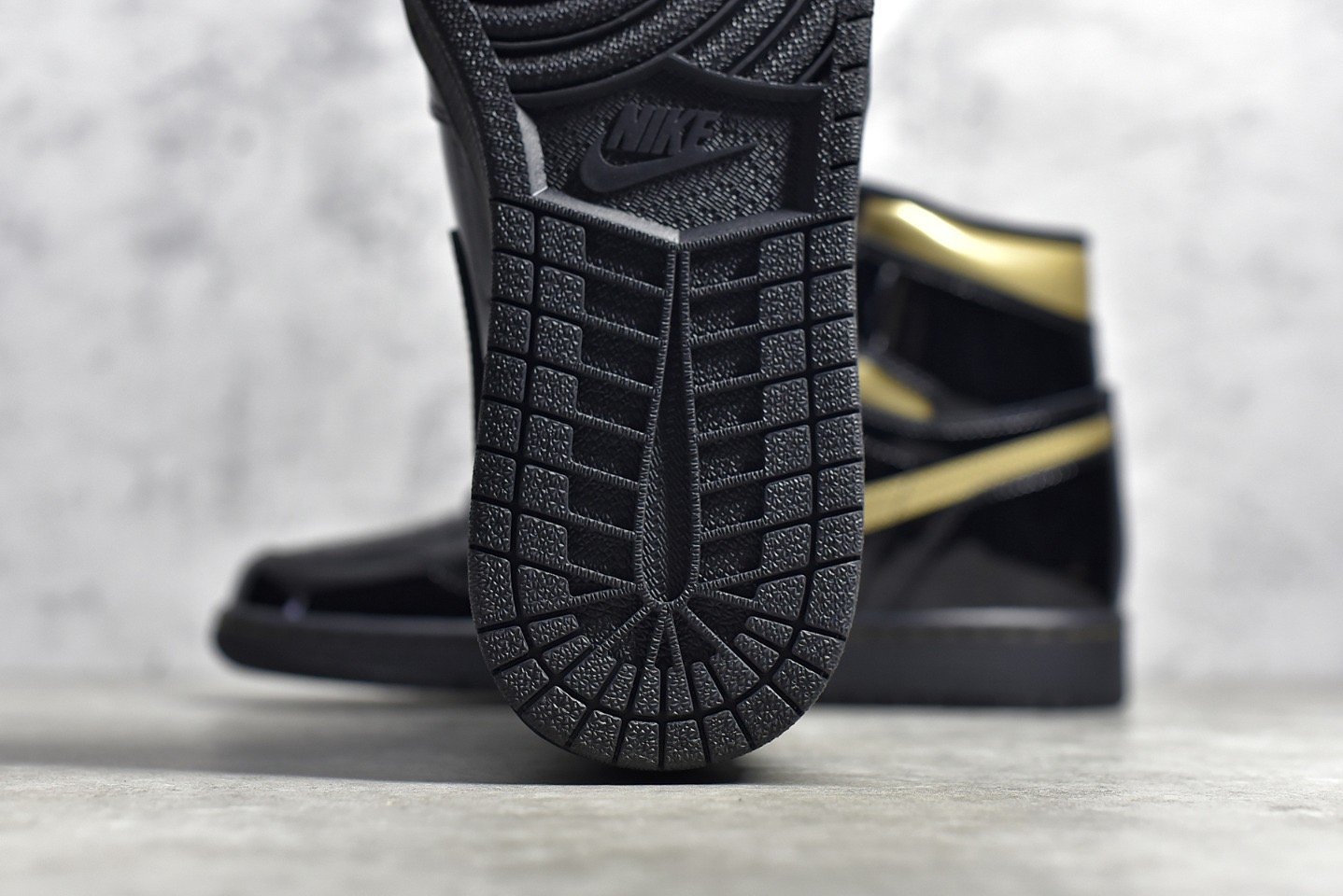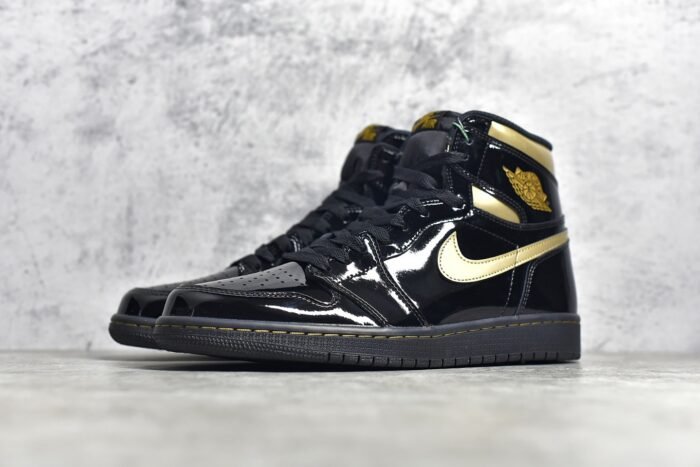 The Jordan 1 Retro High Black Metallic Gold is a luxurious and eye-catching iteration of the classic Air Jordan 1 silhouette. This high-top sneaker features a glossy patent leather upper in a sleek black colorway. accented by striking metallic gold details. The gold accents can be seen on the iconic Nike Swoosh. the Air Jordan wings logo on the ankle collar. and the tongue tag. adding a touch of elegance and sophistication to the design. Additionally. the shoe boasts a white midsole and black outsole. providing a clean and balanced contrast. With its premium materials and bold design. the Jordan 1 Retro High Black Metallic Gold is a standout piece for any sneaker collection.