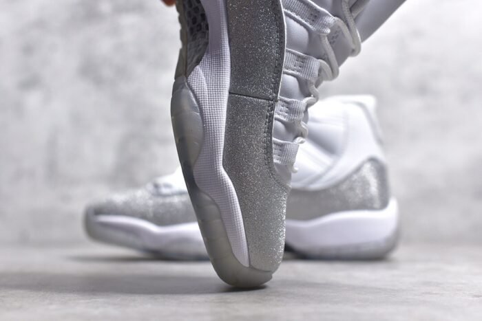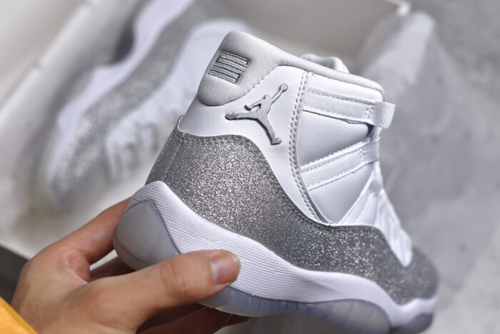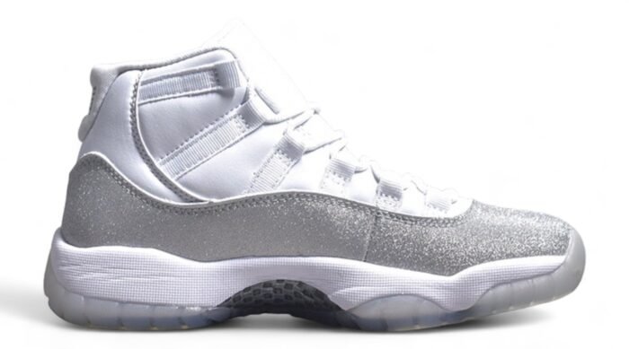 The Jordan 11 Retro AJ11-WMNS Metallic Silver features a striking metallic silver upper with a patent leather mudguard. padded collar. responsive Air-Sole unit. and durable rubber outsole. A stylish and elegant choice tailored specifically for women. offering both sophistication and comfort.
