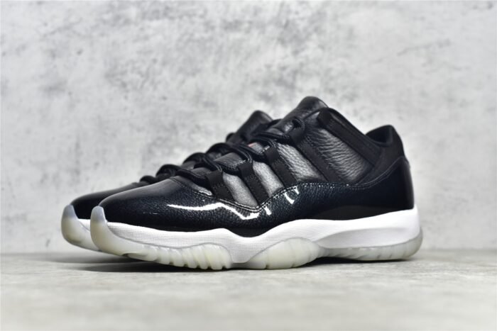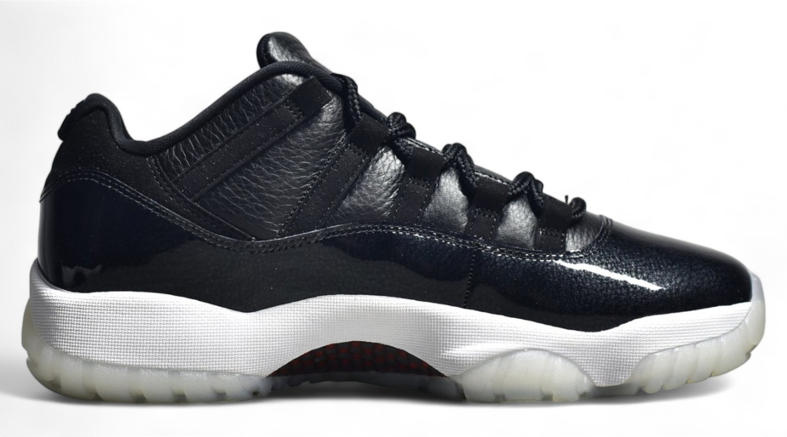 The Jordan 11 Retro Low 72-10 celebrates the iconic 1995-96 Chicago Bulls season with premium materials and a sleek colorway. This legendary sneaker features a black leather upper with subtle red accents. offering a sophisticated and versatile look. The patent leather mudguard adds a touch of luxury. while the padded collar and tongue ensure comfort. With a responsive Air-Sole unit in the heel. it provides cushioned support for all-day wear. The durable rubber outsole with a herringbone pattern ensures traction and stability. Combining heritage design with modern elegance. this pair is a must-have for sneaker enthusiasts.
