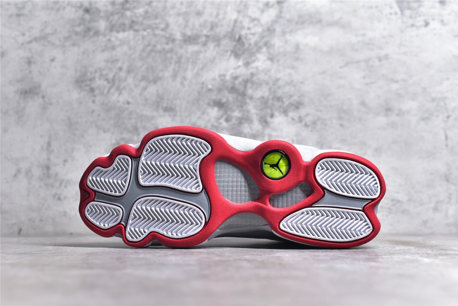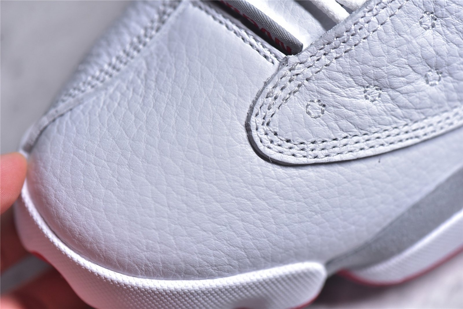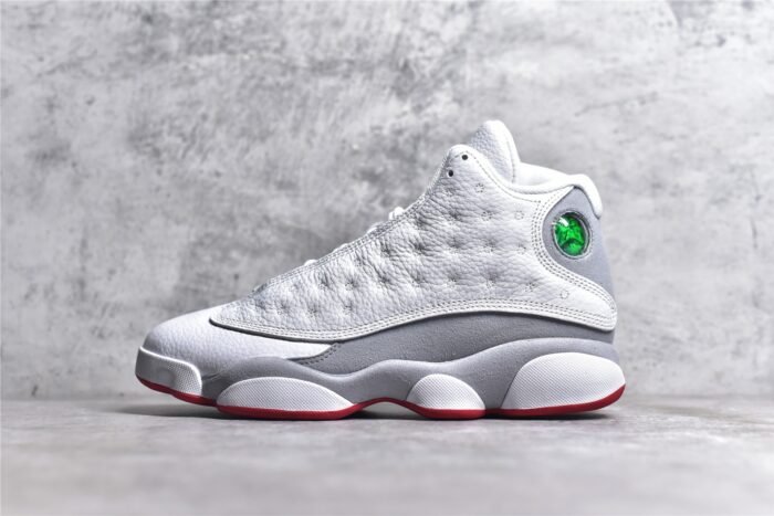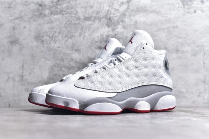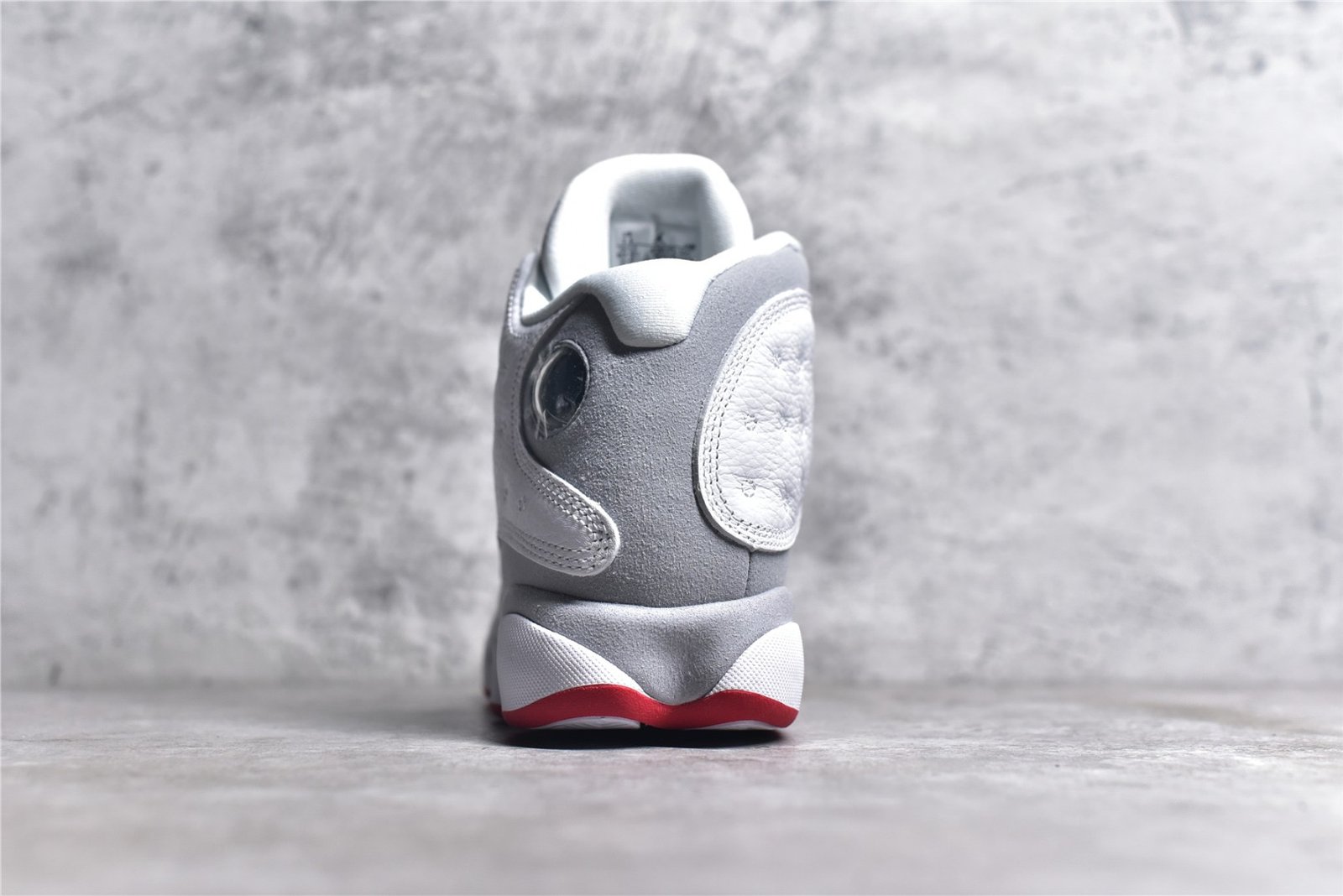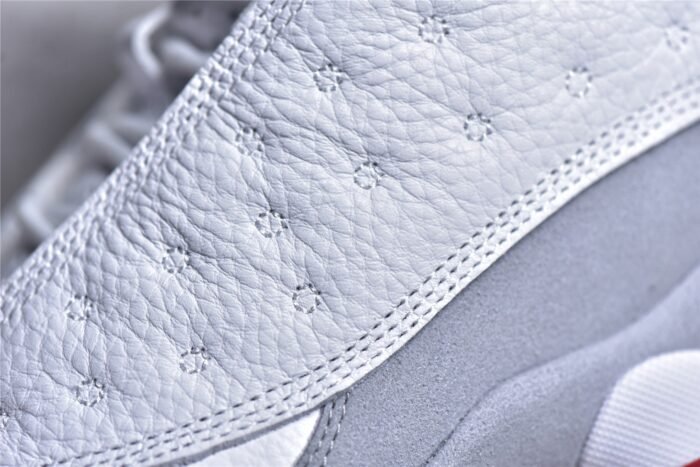 The Jordan 13 “Wolf Grey” introduces a sleek and modern colorway to the iconic silhouette. blending premium materials with contemporary design elements. Crafted with attention to detail. this sneaker features a clean and crisp grey suede upper. exuding sophistication and versatility. The textured leather overlays on the mudguard and heel provide depth and contrast to the design. while the black accents on the midsole. outsole. and Jumpman logo add definition and visual interest. Signature Jordan 13 elements such as the holographic “cat eye” jewel on the heel and unique midsole design maintain the heritage of the silhouette while offering superior comfort and cushioning. The durable rubber outsole with a modified herringbone pattern ensures reliable traction and grip on various surfaces. With its refined color palette and contemporary design. the Jordan 13 “Wolf Grey” is a stylish addition to any sneaker collection.