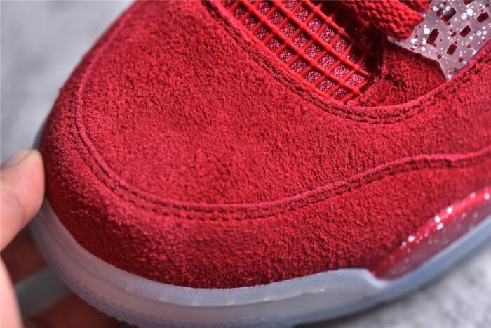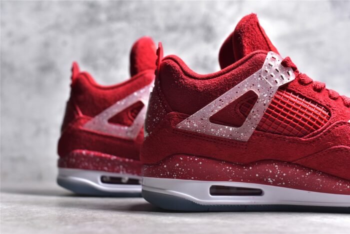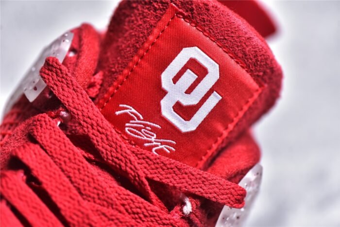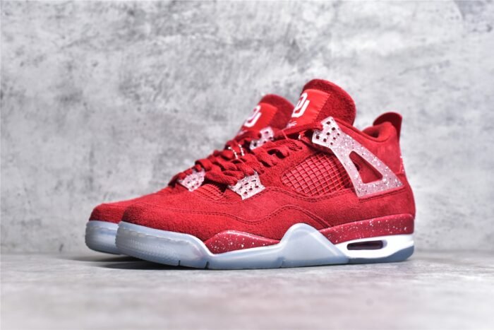 The Jordan 4 Retro Oklahoma Sooners PE is a special edition sneaker celebrating the University of Oklahoma’s athletic excellence. This exclusive sneaker features a luxurious maroon suede upper with crisp white accents. mirroring the university’s iconic colors. The design includes signature Jordan 4 elements such as breathable mesh underlays. a supportive midfoot strap. and a visible Air-Sole unit in the heel for responsive cushioning. Unique to this edition. the shoe showcases Oklahoma’s “OU” logo on the heel tab. adding a distinctive touch to the classic silhouette. The durable rubber outsole with a herringbone pattern ensures enhanced traction and grip. making this pair both stylish and functional. With its rich colorway and exclusive branding. the Jordan 4 Retro Oklahoma Sooners PE is a must-have for sneaker enthusiasts and fans of Oklahoma athletics.