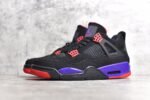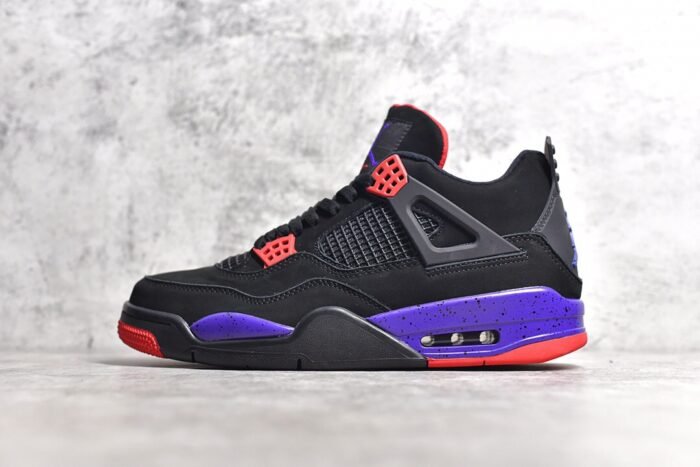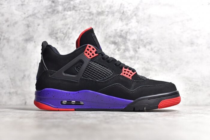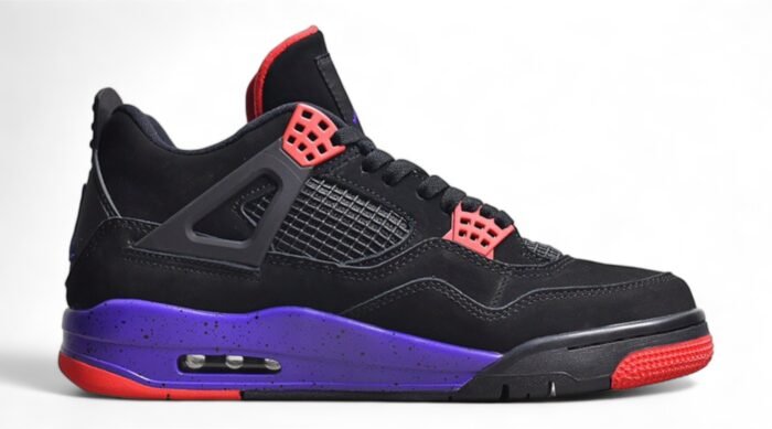 The Jordan 4 Raptor is a tribute to the iconic Toronto Raptors basketball team. This sneaker features a sleek black nubuck upper with vibrant purple and red accents. creating a bold look.