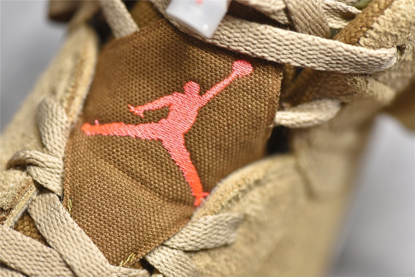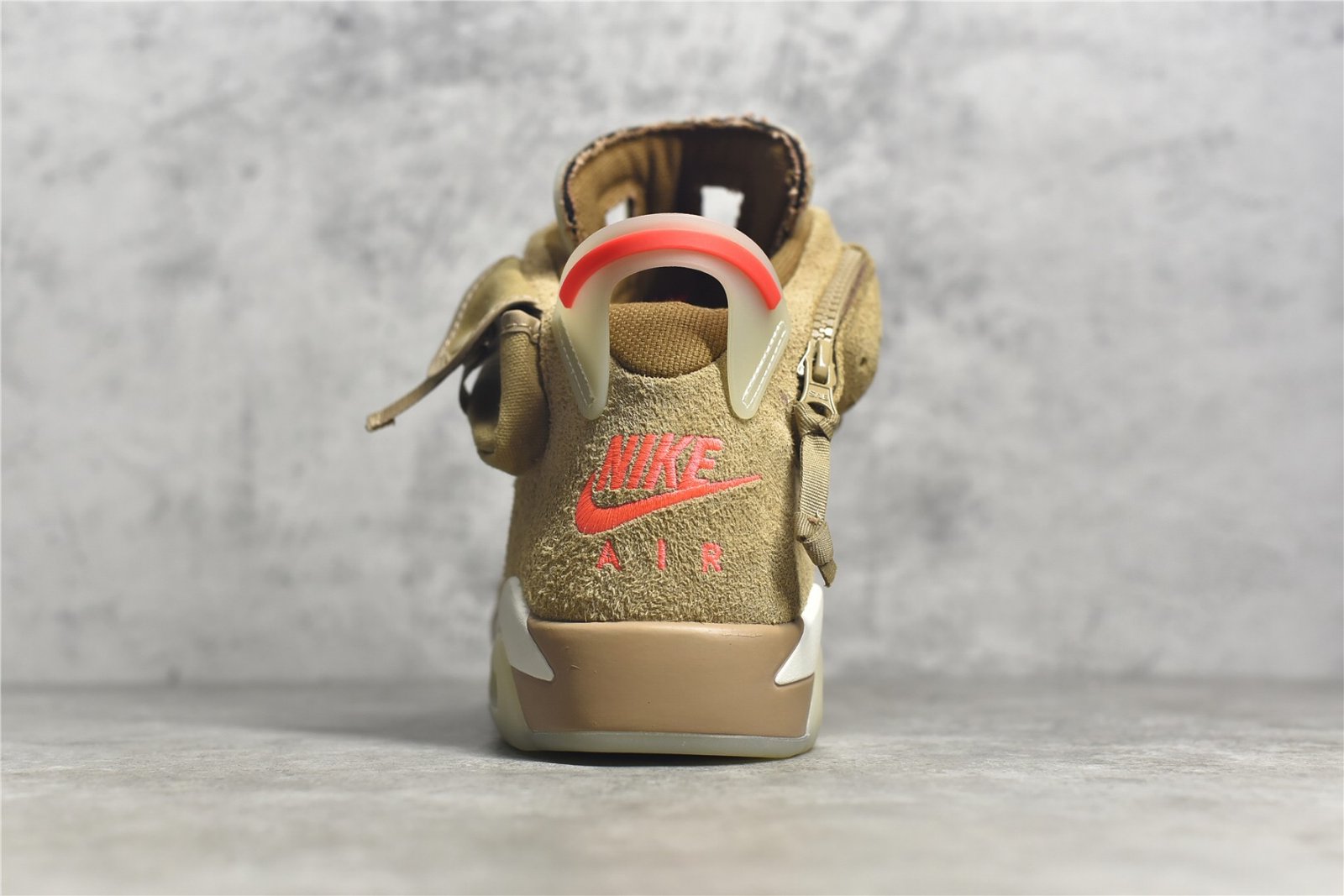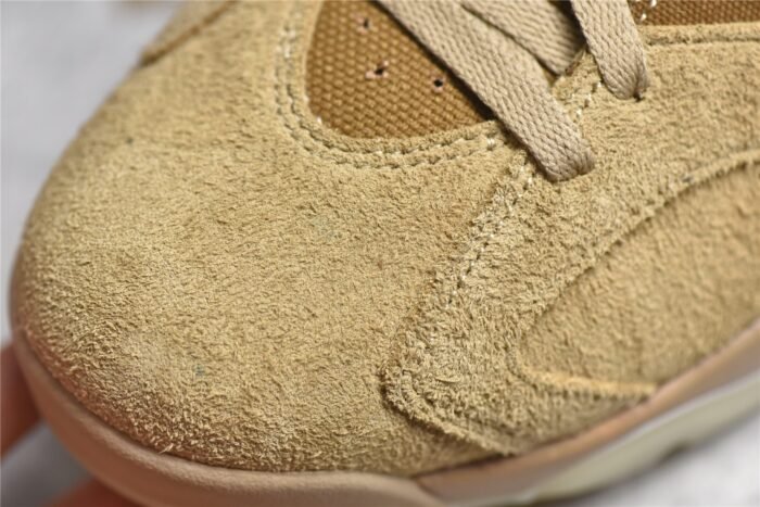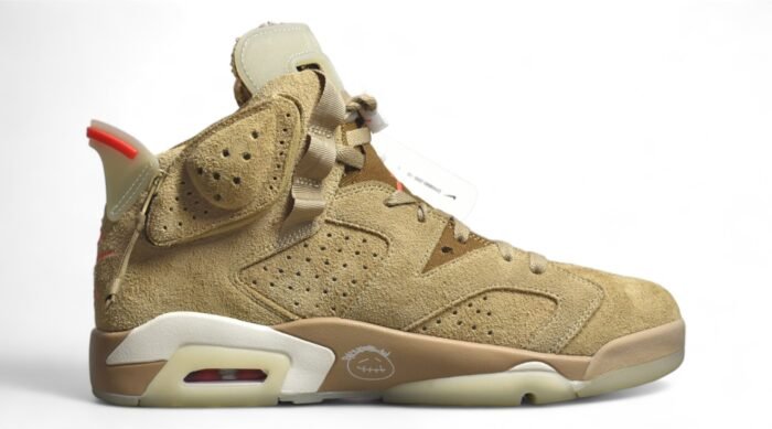 The Jordan 6 Retro Travis Scott British Khaki is a highly anticipated collaboration between Jordan Brand and the renowned rapper Travis Scott. This iteration of the iconic Air Jordan 6 silhouette features a premium suede and leather upper in a unique British Khaki colorway. offering a rugged and versatile aesthetic. The design incorporates unique details such as a stash pocket on the collar. Travis Scott’s signature “Cactus Jack” branding on the lace lock. and his iconic “smiley face” logo on the heel. Additionally. the shoe boasts hits of bright crimson on the lace toggle and heel tab. adding a pop of contrast to the overall design. With its premium materials and distinctive design elements. the Jordan 6 Retro Travis Scott British Khaki is sure to be a standout addition to any sneaker collection.
