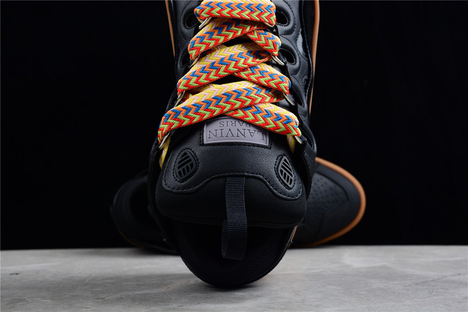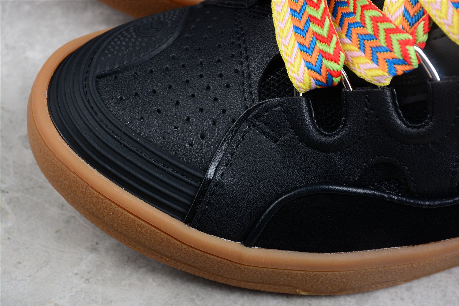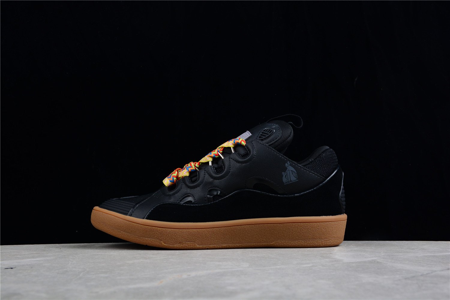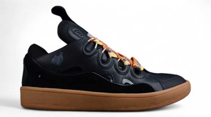The Lanvin ‘Curb’ Sneakers Black & Multicolor blend sophisticated design with a vibrant twist. These low-top sneakers feature a sleek black leather upper with striking multicolored accents. adding a dynamic and modern flair to the classic silhouette. The padded collar and tongue ensure comfort. while the lace-up front provides a secure fit. With a durable rubber outsole for traction and durability. these sneakers are perfect for fashion-forward individuals looking to make a stylish statement.