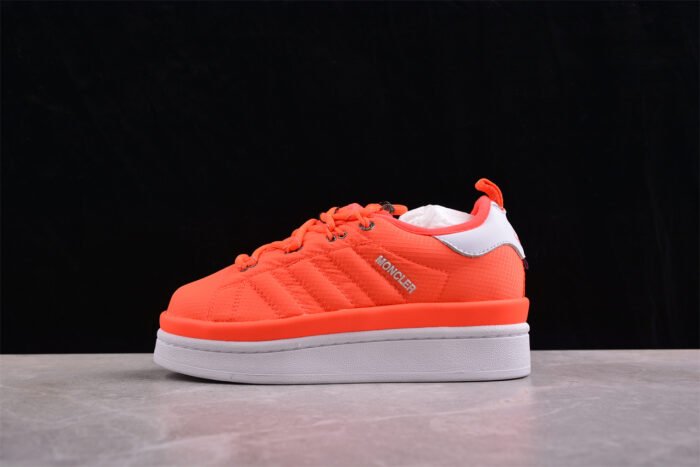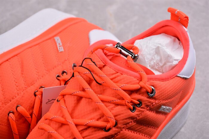 The Moncler Emilien Sneakers in Orange stand out with their vibrant color and premium materials. These stylish sneakers feature a combination of breathable mesh and smooth leather in a bold orange colorway. offering a chic yet sporty look. The EVA midsole ensures lightweight cushioning. while the padded collar and tongue provide extra comfort. The slip-on style with elasticated panels ensures a snug fit. perfect for easy on and off wear. Durable rubber outsole with a textured pattern enhances traction and grip. This pair blends luxurious style with everyday functionality. making it a must-have for fashion-forward individuals.