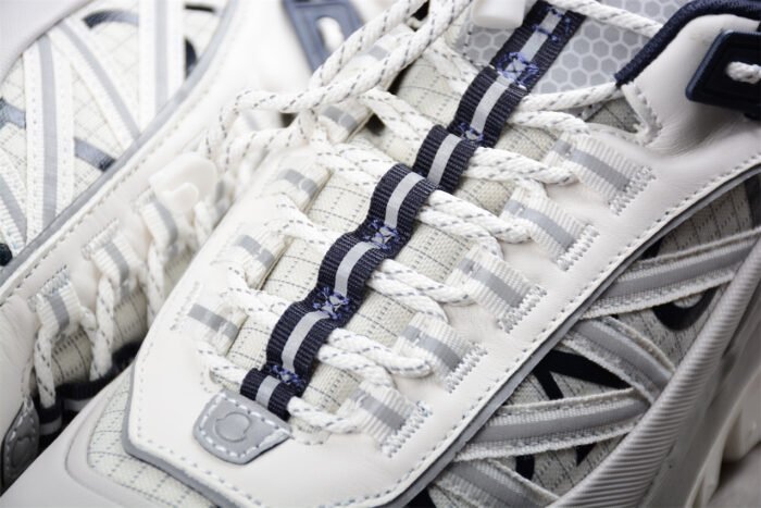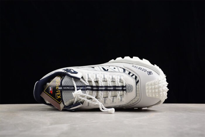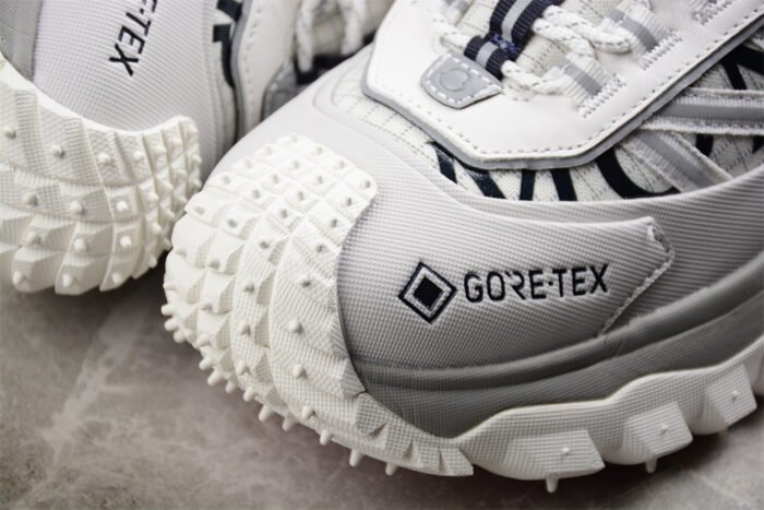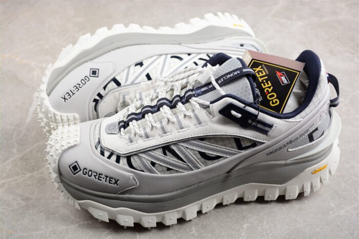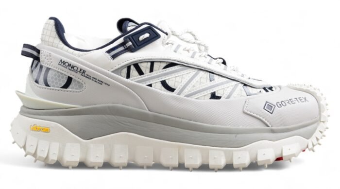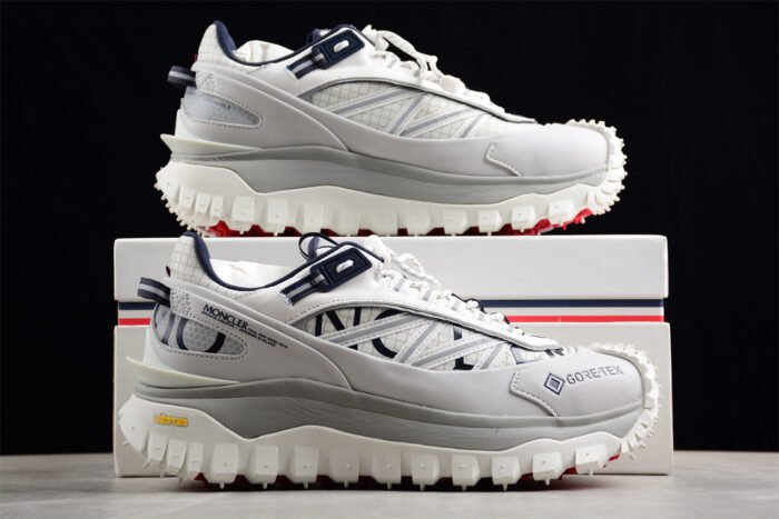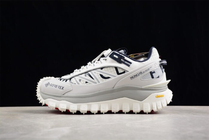 The Moncler Gore-Tex Trailgrip Sneakers in White and Navy stand out with their durable design and premium materials. These stylish sneakers feature a combination of white and navy. offering a sleek yet functional look. The Gore-Tex upper ensures waterproof protection. while the cushioned insole provides extra comfort. The Vibram sole delivers excellent traction and stability. perfect for various terrains. Reinforced toe and heel areas enhance durability. making them ideal for outdoor adventures. This pair blends innovative technology with modern style. making it a must-have for active individuals.