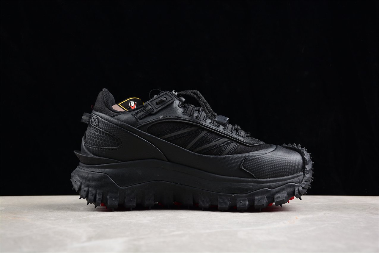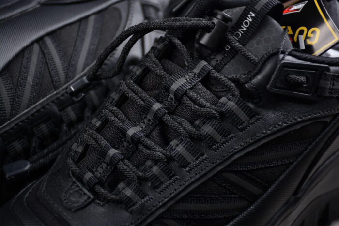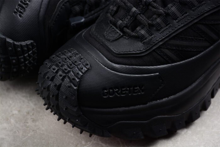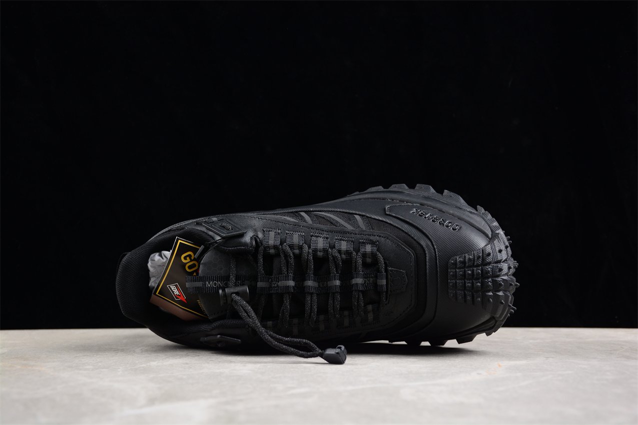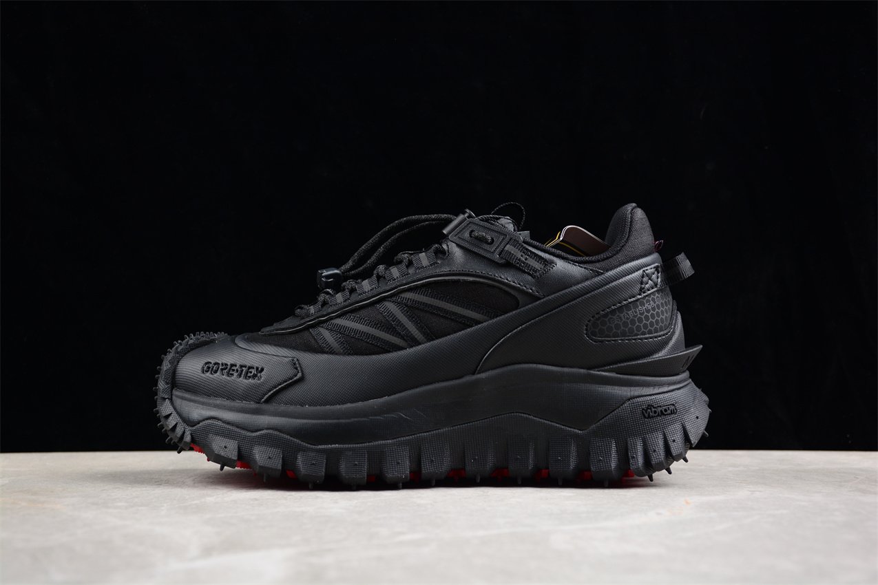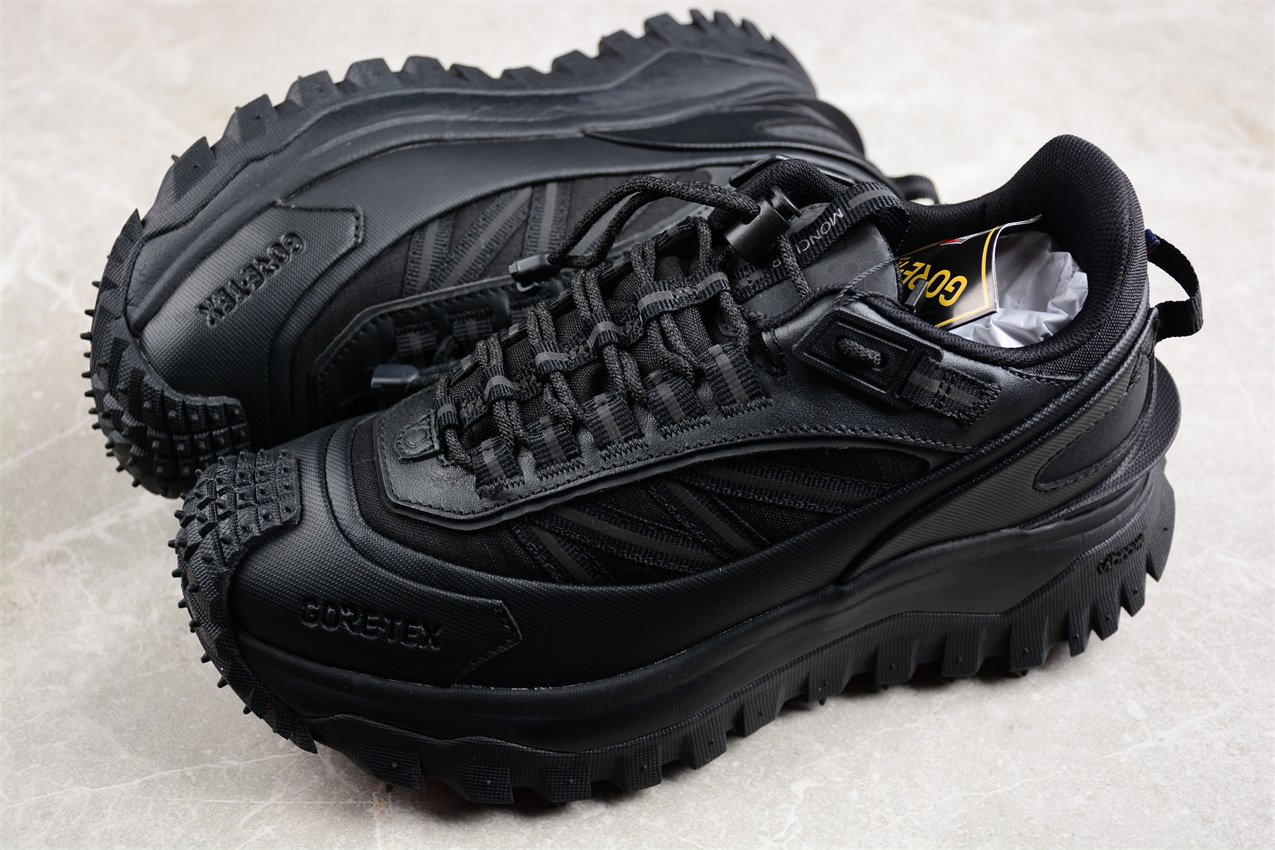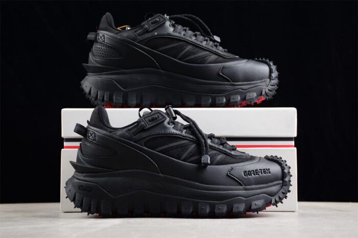 The Moncler Trailgrip GTX in All Black stands out with its sleek monochromatic design and robust construction. These stylish sneakers feature an all-black upper. offering a sophisticated yet functional look. The Gore-Tex upper ensures waterproof protection. while the cushioned insole provides all-day comfort. The Vibram sole delivers excellent traction and stability. perfect for various terrains. Reinforced toe and heel areas enhance durability. making them ideal for outdoor adventures. This pair blends innovative technology with modern style. making it a must-have for active individuals.