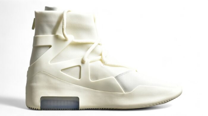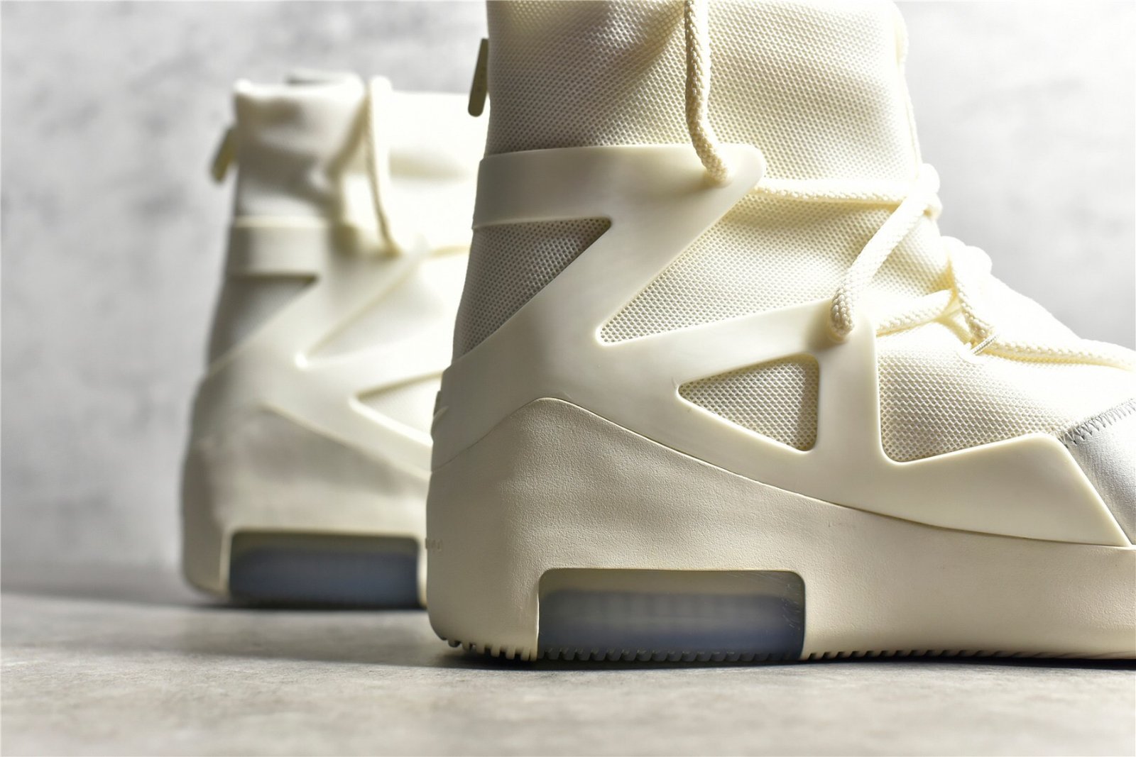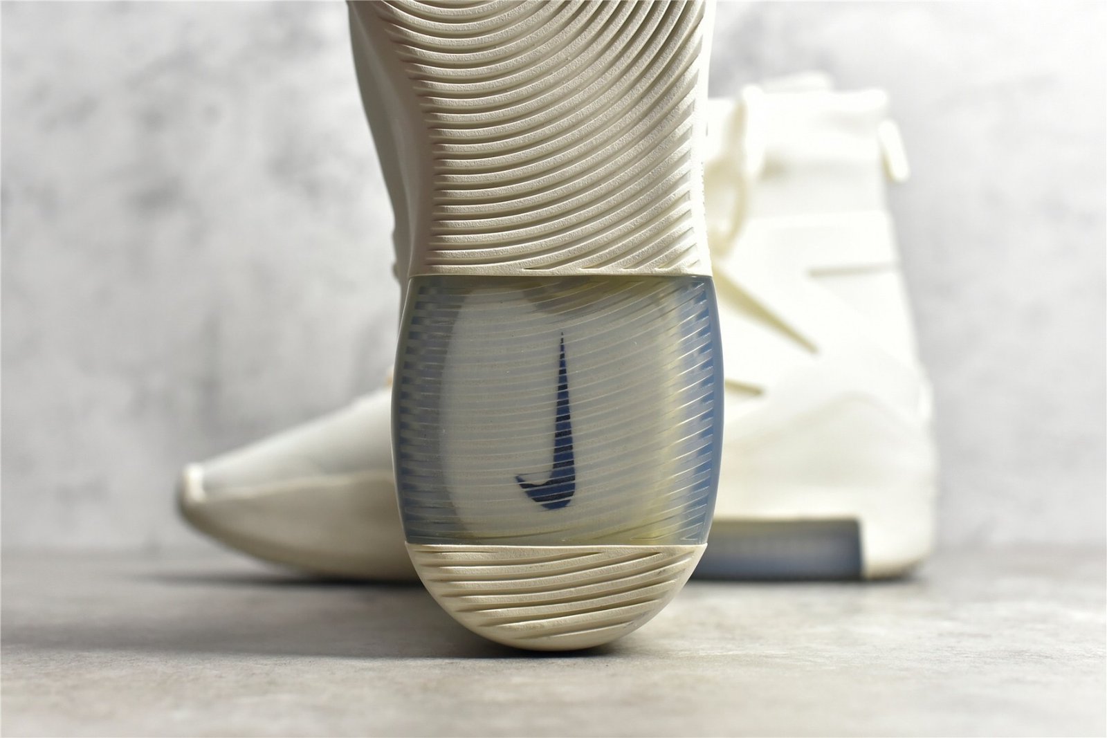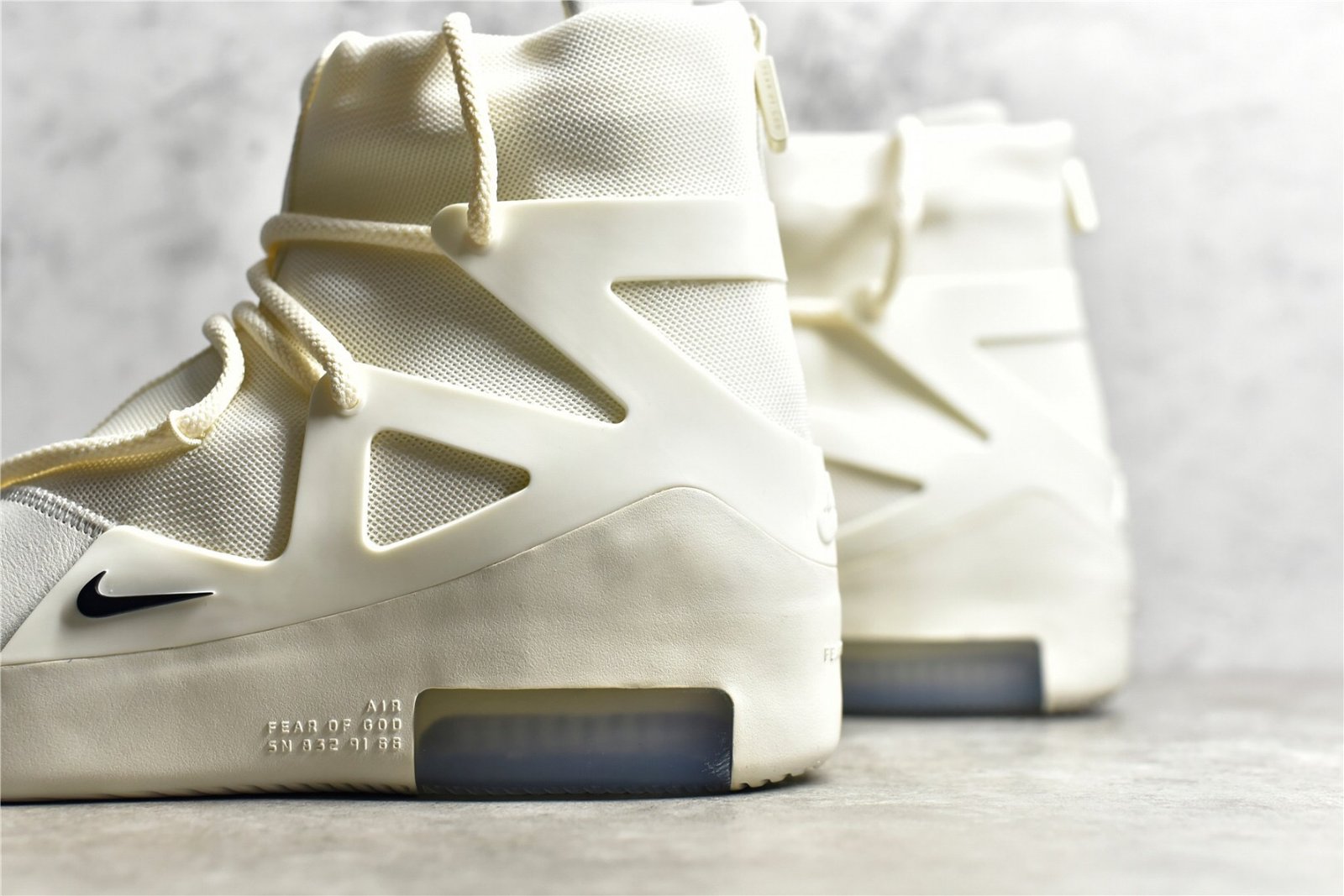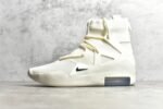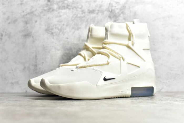 The Nike Air Fear Of God 1 Sail Black AR4237-100 combines luxury and performance with a sleek. high-top silhouette designed by Jerry Lorenzo. Featuring a premium sail-colored leather upper with contrasting black accents. these sneakers exude a sophisticated yet sporty aesthetic. The adjustable ankle strap provides a secure fit. while the padded collar and tongue offer enhanced comfort. A visible double-stacked Zoom Air unit in the heel delivers responsive cushioning. ideal for all-day wear. Finished with a durable rubber outsole for traction and grip. these sneakers seamlessly blend fashion-forward design with athletic functionality.