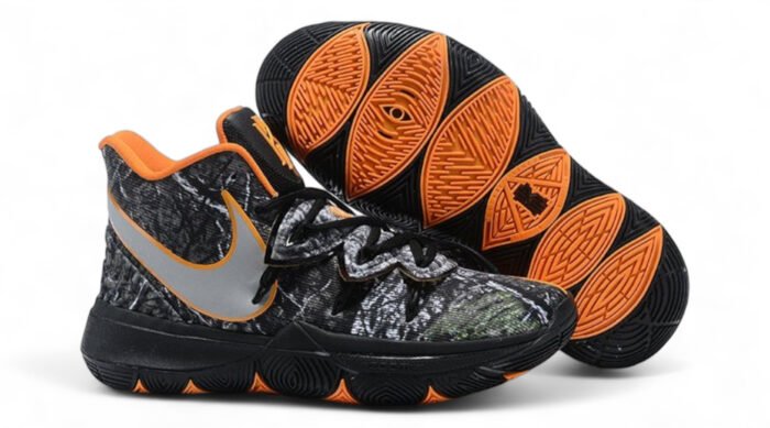 The Nike Kyrie 5 x Taco PE stands out with its bold and unique design inspired by streetwear. This sneaker features a mix of black and vibrant orange accents. offering a striking and eye-catching look. The engineered mesh upper ensures breathability. while the padded collar and tongue provide extra comfort. The Zoom Turbo unit in the forefoot delivers responsive cushioning. perfect for quick moves on the court. A durable rubber outsole with a curved pattern enhances traction and grip. This pair blends street style with high performance. making it perfect for basketball fans.