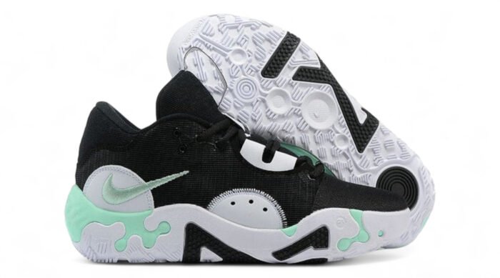 The NIKE PG 6 x MINT GREEN combines a refreshing mint green colorway with top-tier performance features. This dynamic sneaker features a mint green mesh upper. providing a vibrant and stylish appearance. Its lightweight design ensures breathability. complemented by a padded collar and tongue for enhanced comfort. The React foam midsole offers responsive cushioning. ideal for intensive play. Completing the design is a durable rubber outsole with a multidirectional pattern that enhances traction and grip. This pair seamlessly blends striking aesthetics with advanced functionality. making it essential for basketball enthusiasts.