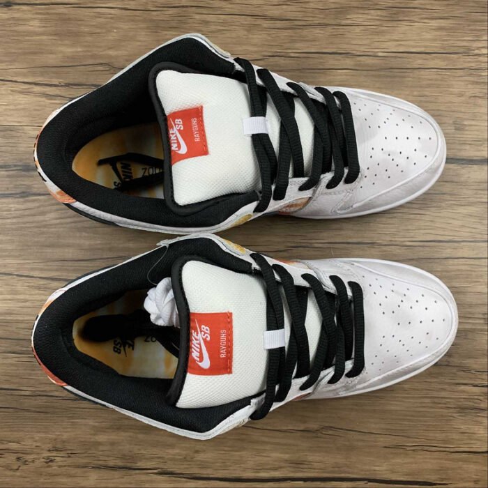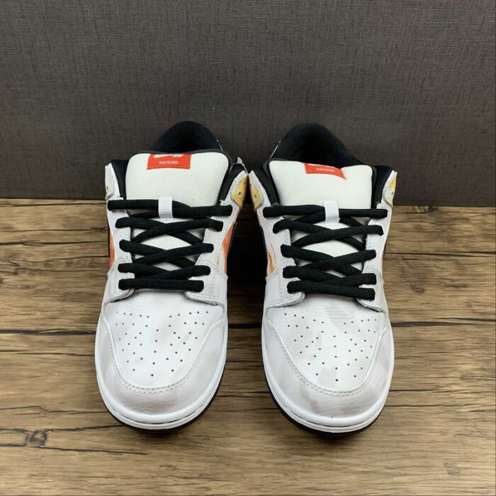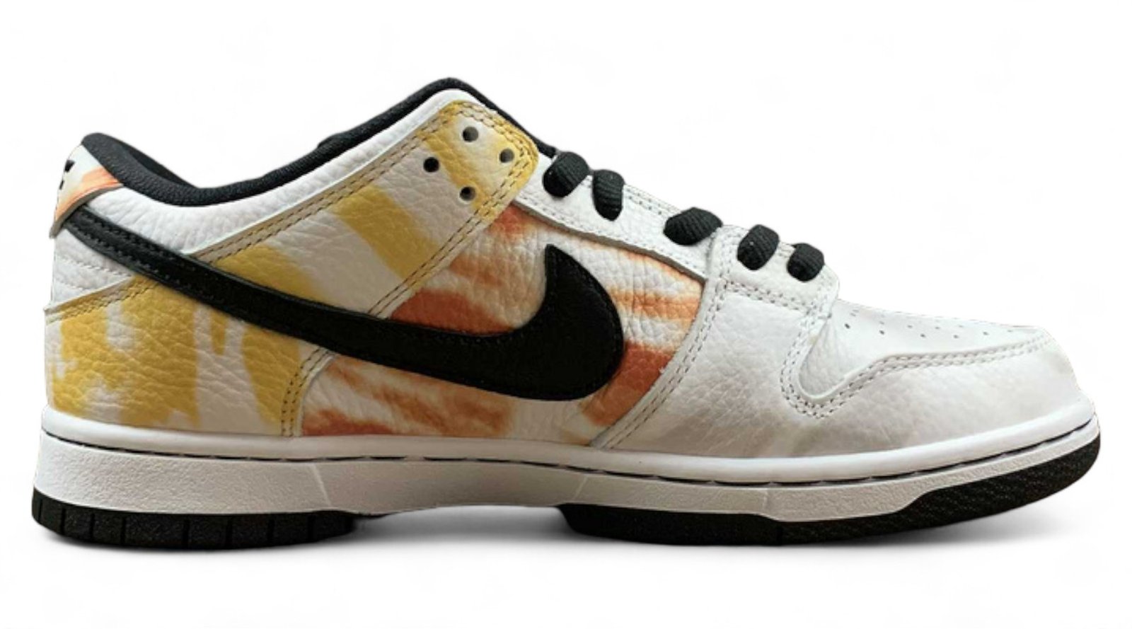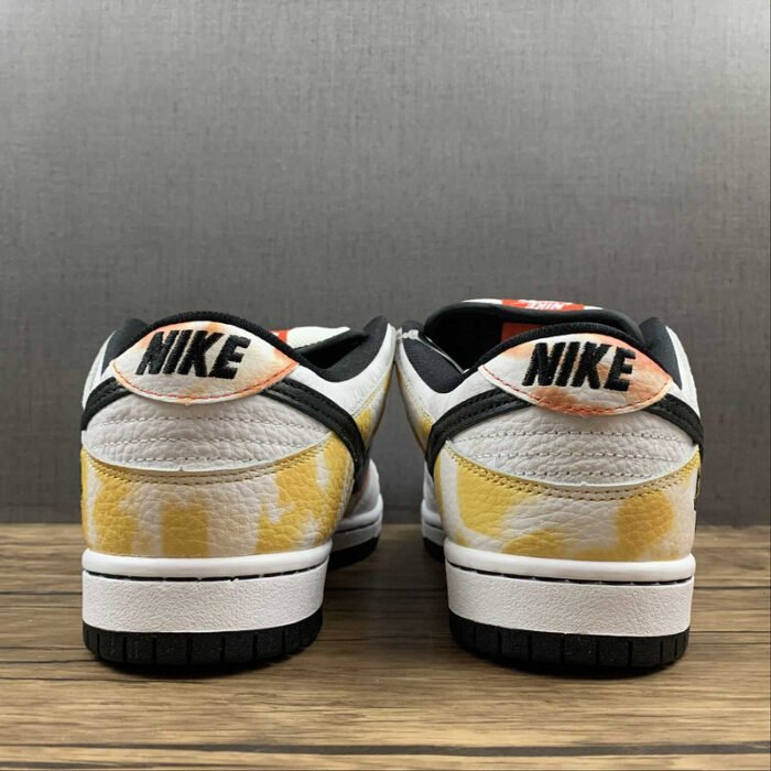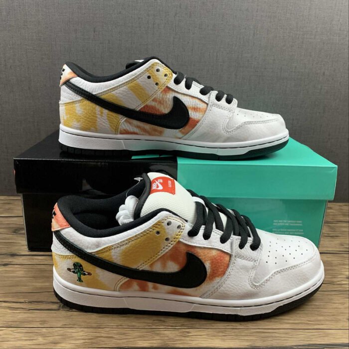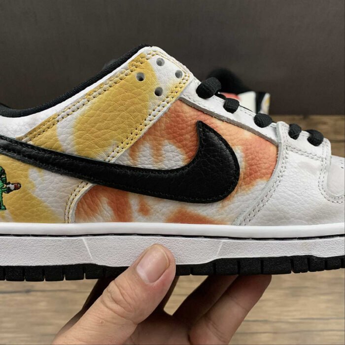 The SB Dunk Low Raygun Tie-Dye White (BQ6832-101) features a white leather upper with vibrant tie-dye patterns and orange accents. Includes padded tongue. Zoom Air cushioning. and durable rubber outsole. Ideal for both skateboarding and casual wear.
