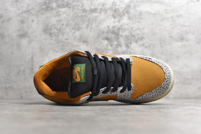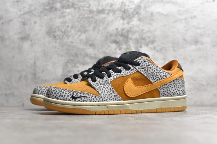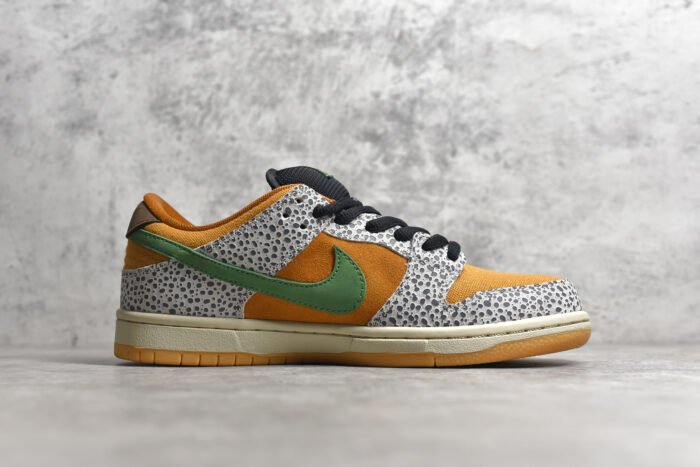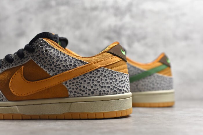The SB Dunk Low Safari CD2563-002 draws inspiration from the iconic “Safari” print made famous by Nike’s Air Safari and Air Max 1 models. Here are the typical features of this sneaker:
