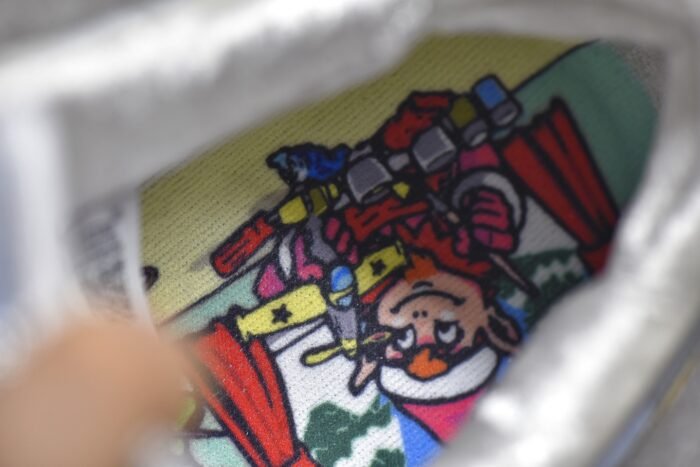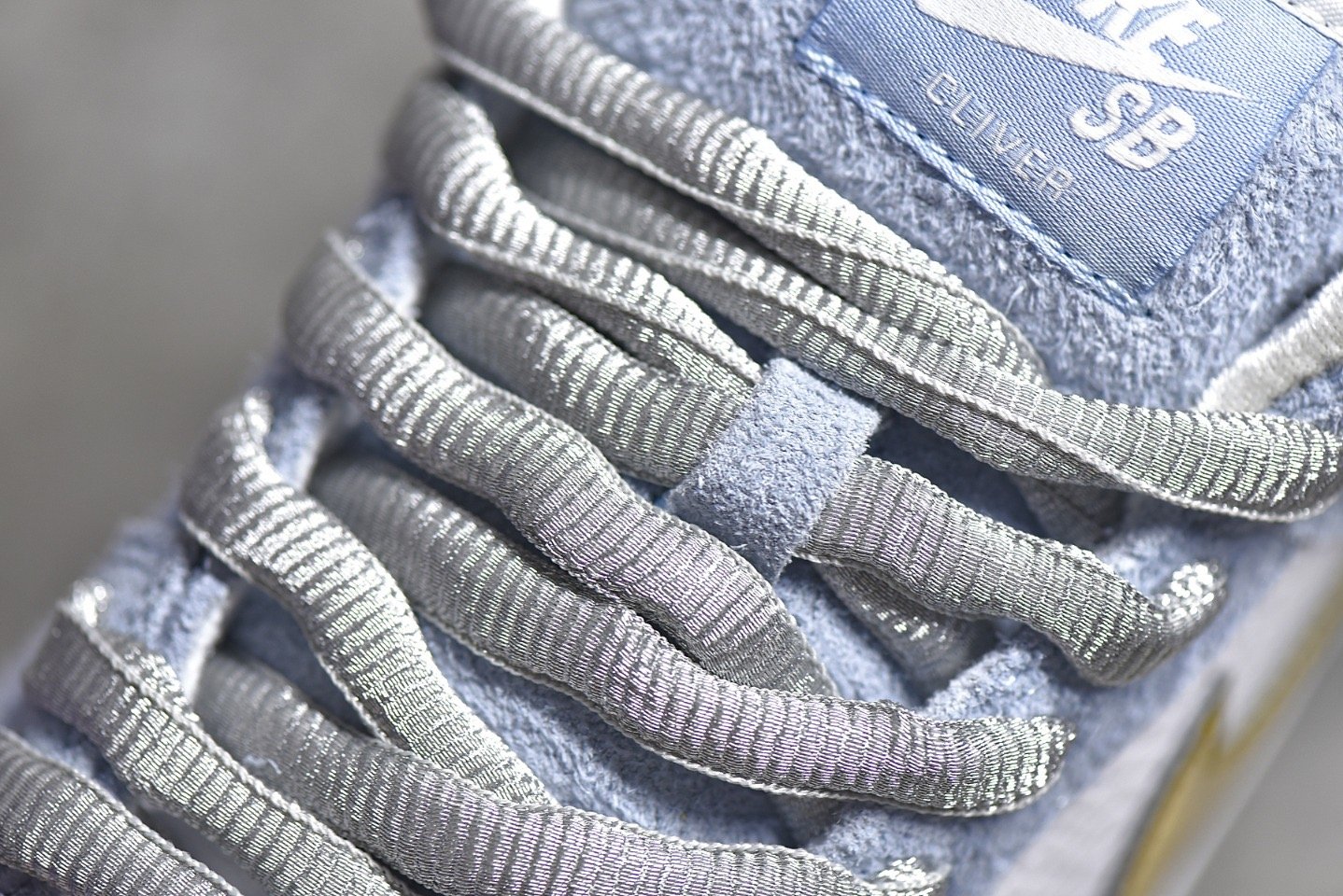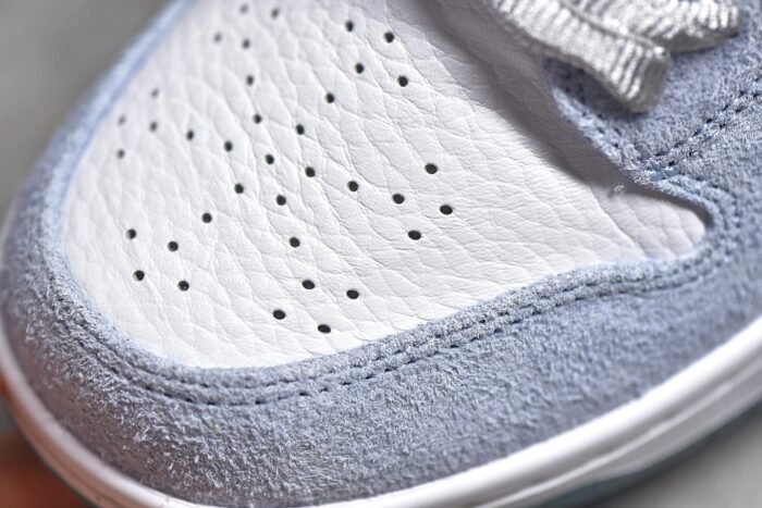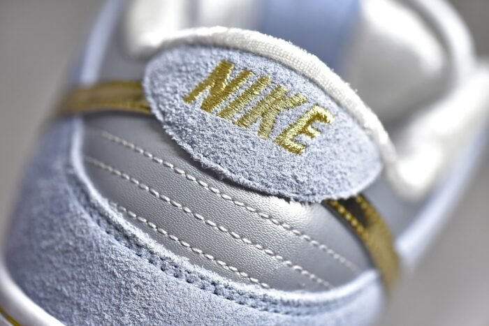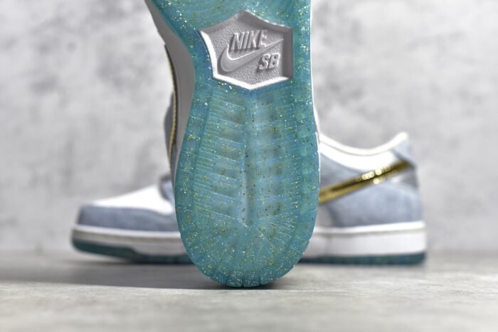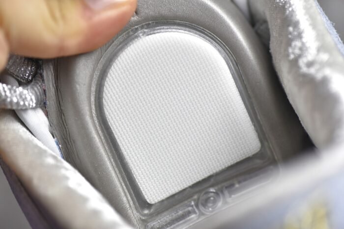 - Design Elements: This sneaker features a white. blue. and metallic gold colorway with intricate details. It includes special graphics on the insoles and glittery gold accents. The icy blue outsole adds a unique touch. making it stand out.