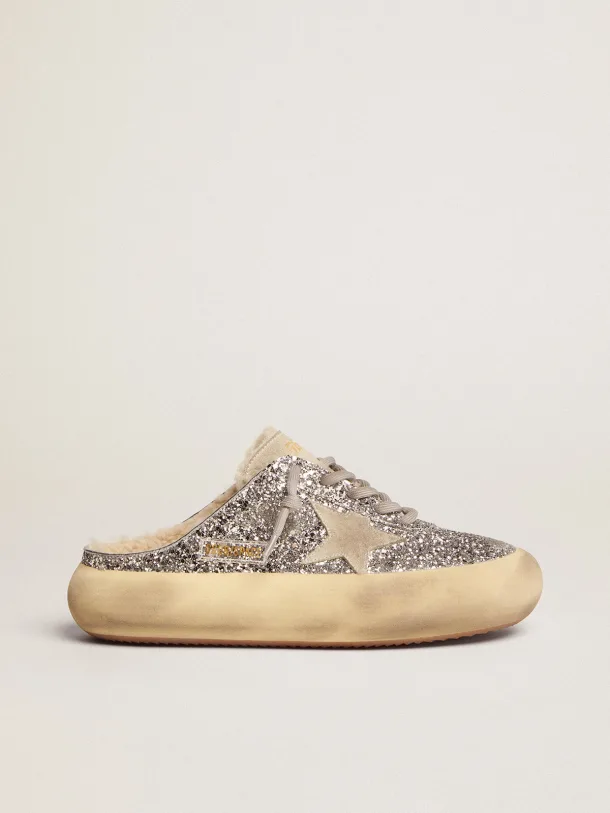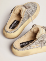 The Space-Star Sabot shoes stand out with their dazzling design and premium materials. These iconic sabot shoes feature silver glitter with a cozy shearling lining. offering a glamorous yet warm look. The glitter material ensures a striking appearance. while the padded insole provides extra comfort. The shearling lining adds warmth. perfect for cooler days. The slip-on design allows for easy wear. and the durable rubber outsole enhances traction and grip. This pair blends fashion with functionality. making it a must-have for style enthusiasts.